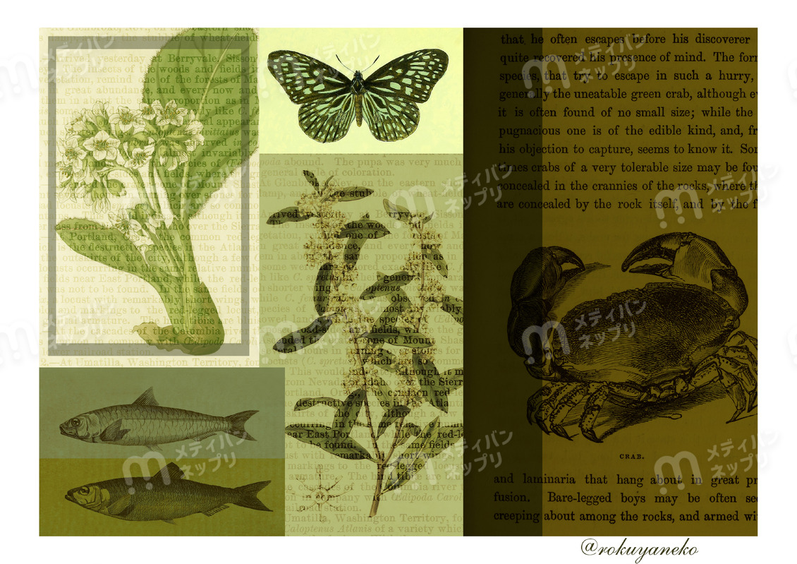グリーン系のデザインペーパーですボタニカル、蝶、魚、カニ