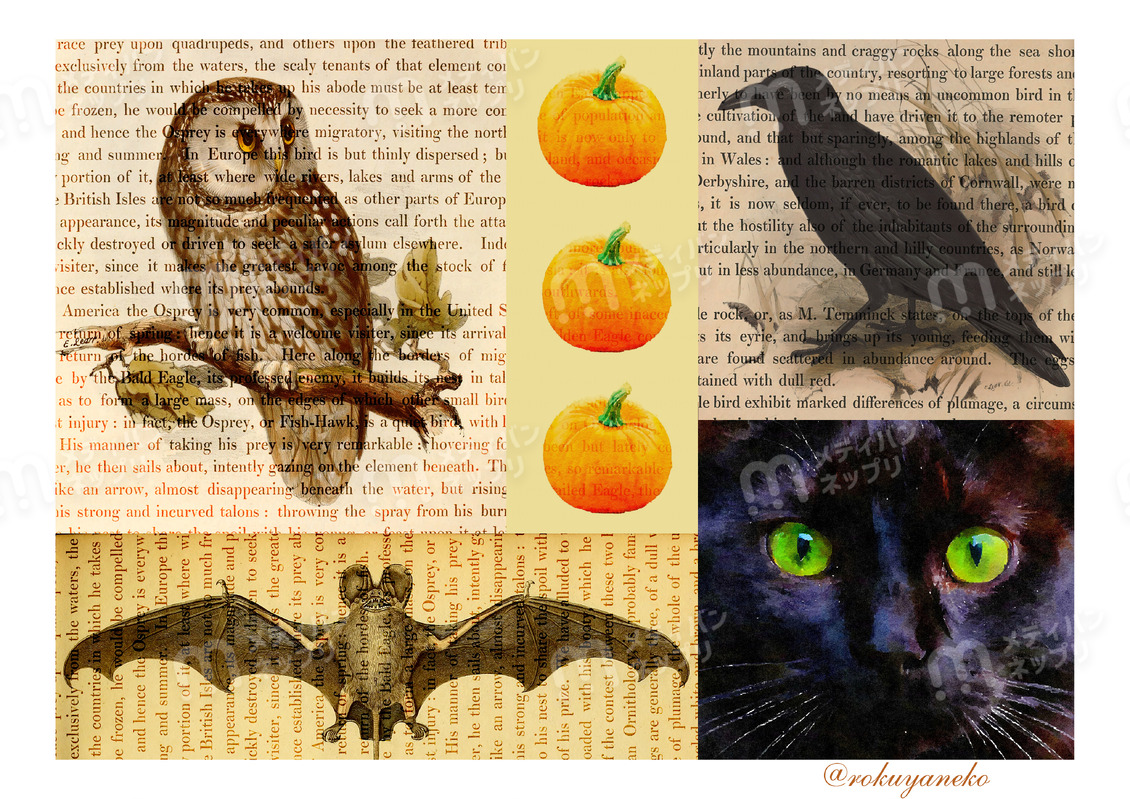 ハロウィン系のデザインペーパーですフクロウ、カラス、コウモリ、カボチャ、黒猫